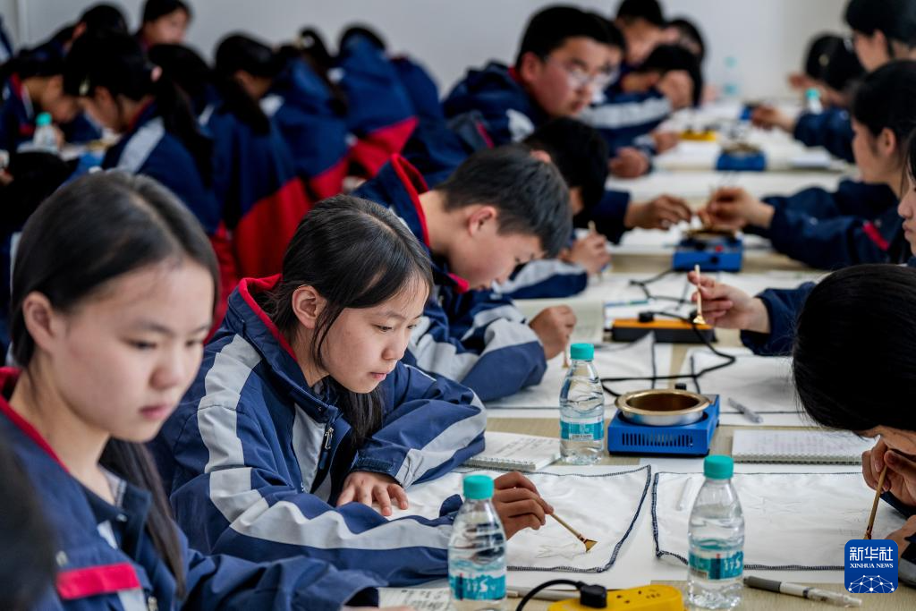 5月12日,威信县第一中学的学生在大屏上红色研学实践基地制作扎西会议主题蜡染。