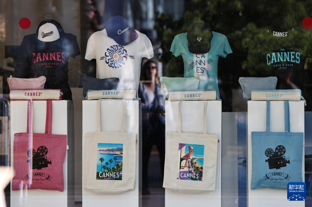 这是5月12日在法国南部海滨城市戛纳拍摄的戛纳国际电影节主题文创产品。