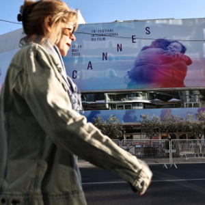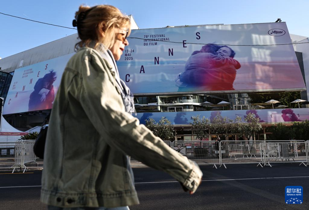 5月12日,在法国南部海滨城市戛纳,一名行人经过电影宫外的戛纳国际电影节海报。