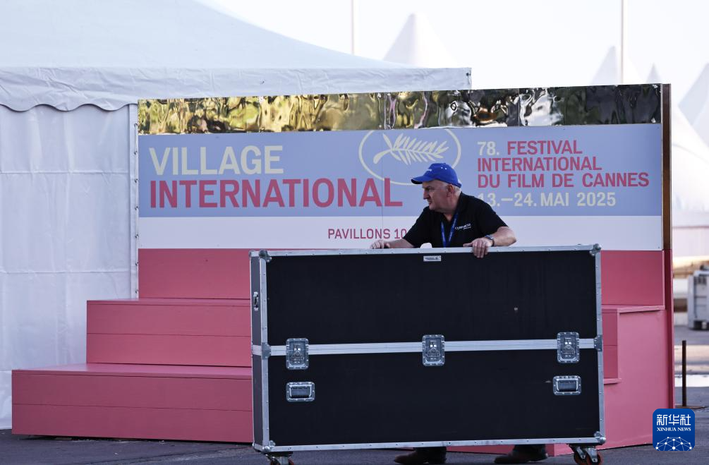 5月12日,在法国南部海滨城市戛纳,一名工作人员为戛纳电影节即将开幕忙碌。
