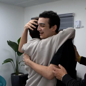5月12日,艾丹·亚历山大(中)抵达位于以色列南部的一处临时接收点。
