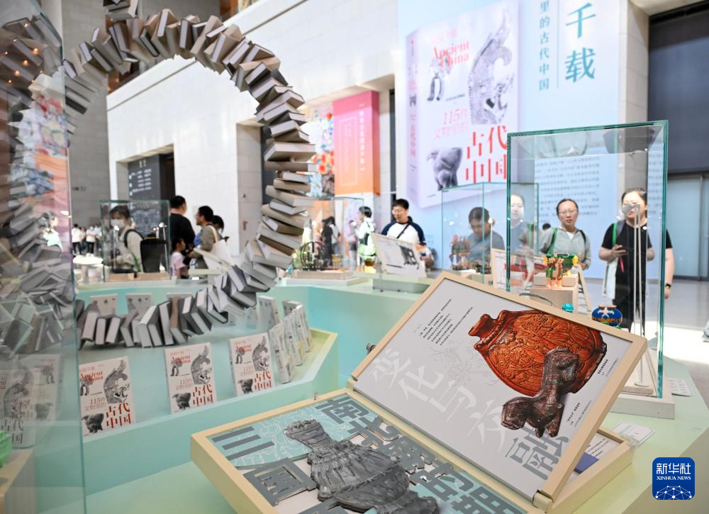 这是中国国家博物馆内摆放的《思接千载:115件文物里的古代中国》图书模型(5月13日摄)。