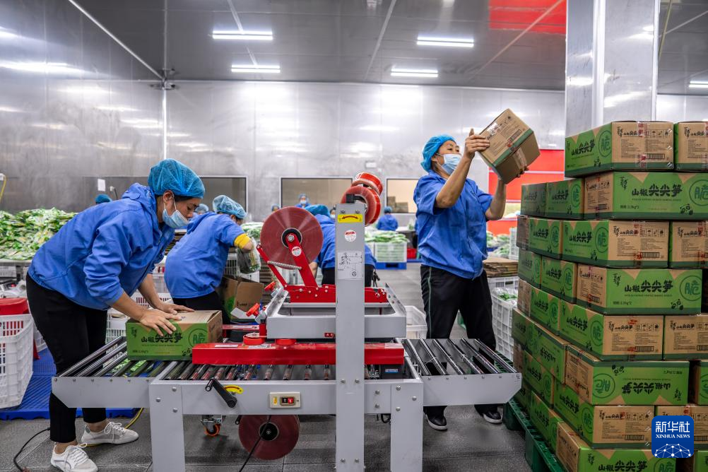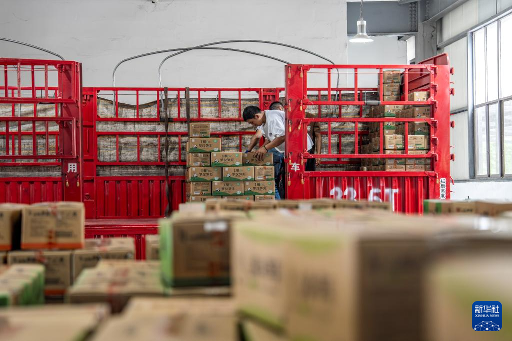 5月14日,在盐津县中和镇中和村竹产业园区,工人将竹笋产品封箱。
