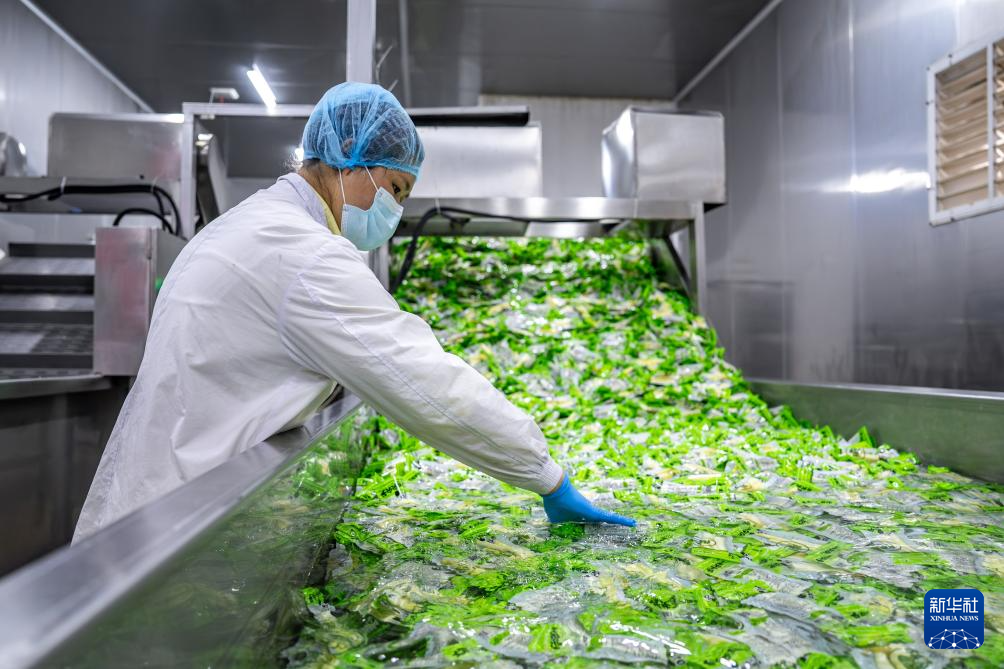 5月14日,在盐津县中和镇中和村竹产业园区,工人在全自动高压清洗线上挑出不合格竹笋。