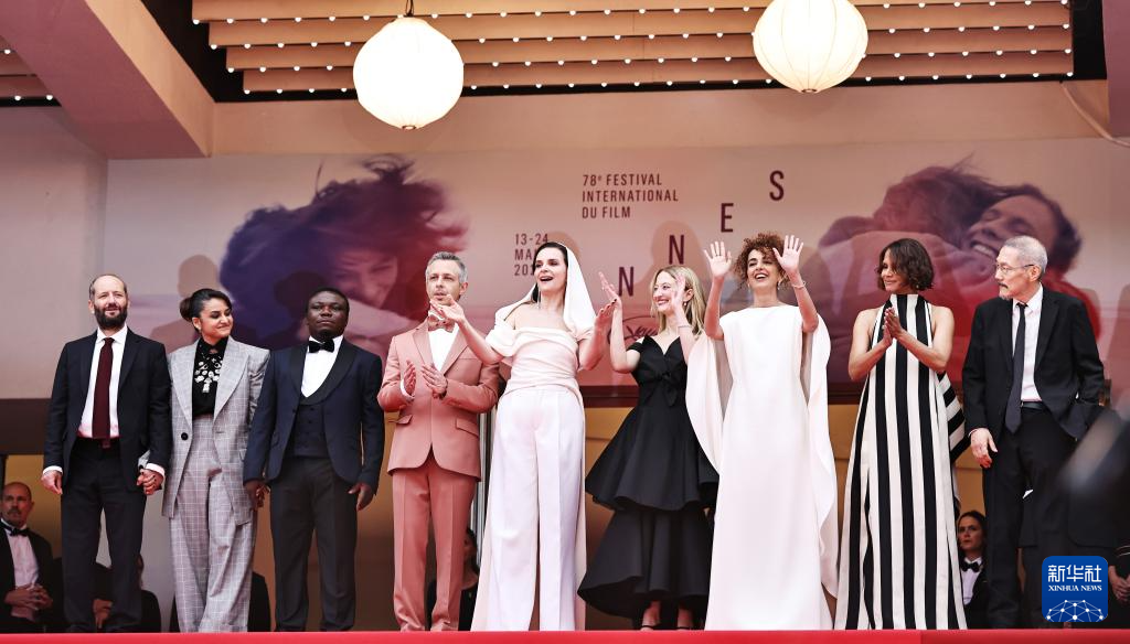5月13日,在法国戛纳举行的第78届戛纳国际电影节上,法国导演阿梅莉·博南(左四)携开幕影片《启程之日》主创人员亮相开幕式红毯。