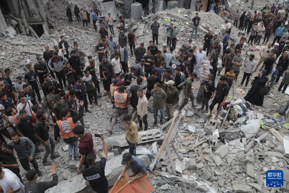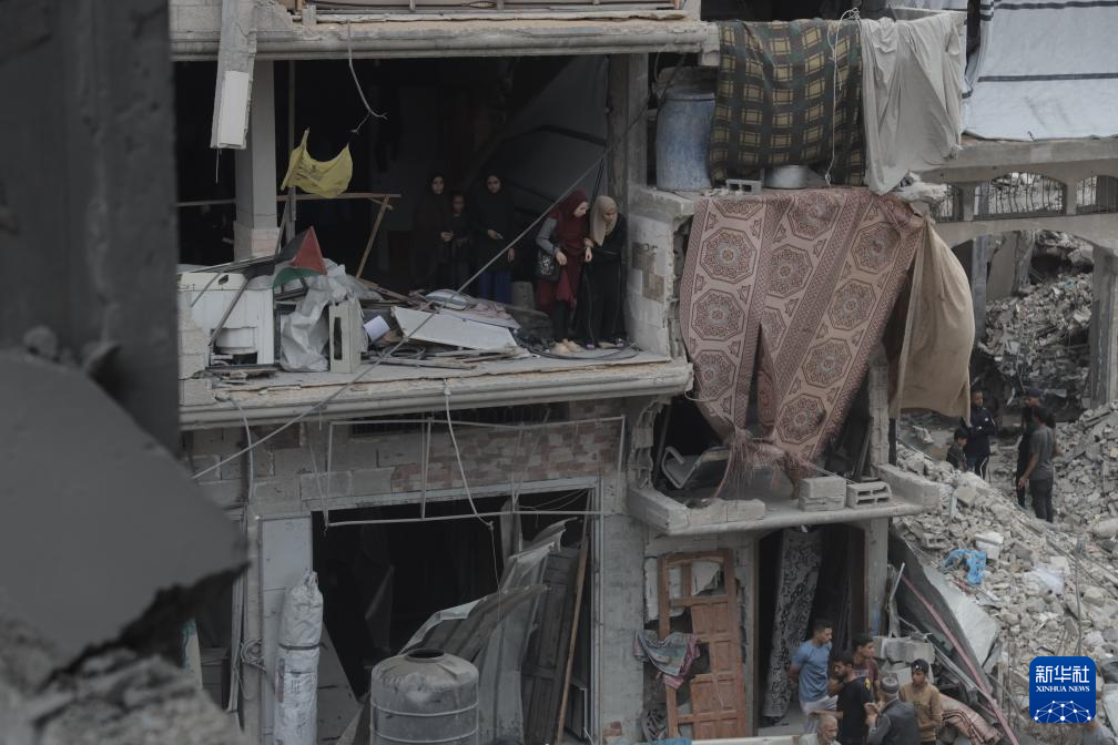 5月15日,在加沙地带北部杰巴利耶难民营,巴勒斯坦人查看以军轰炸后的建筑废墟。