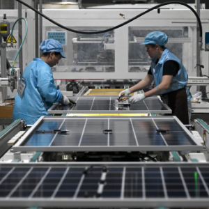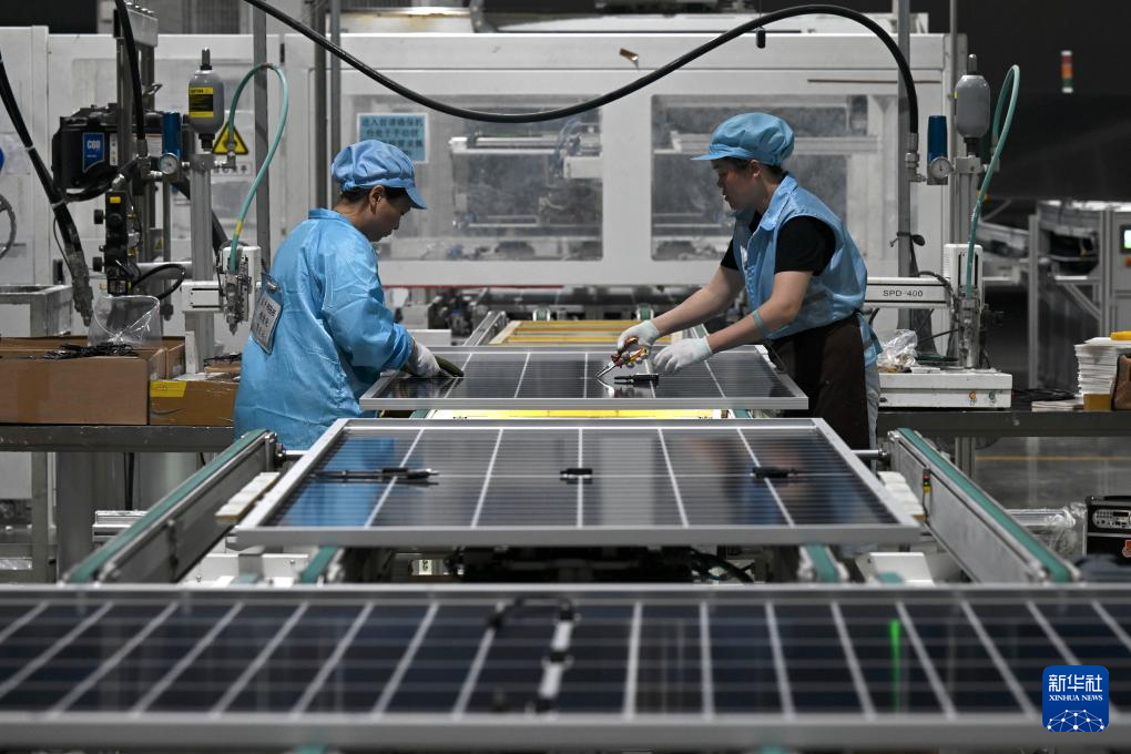 5月14日,工作人员在一道新能源科技(蚌埠)有限公司的生产车间内组装光伏面板。