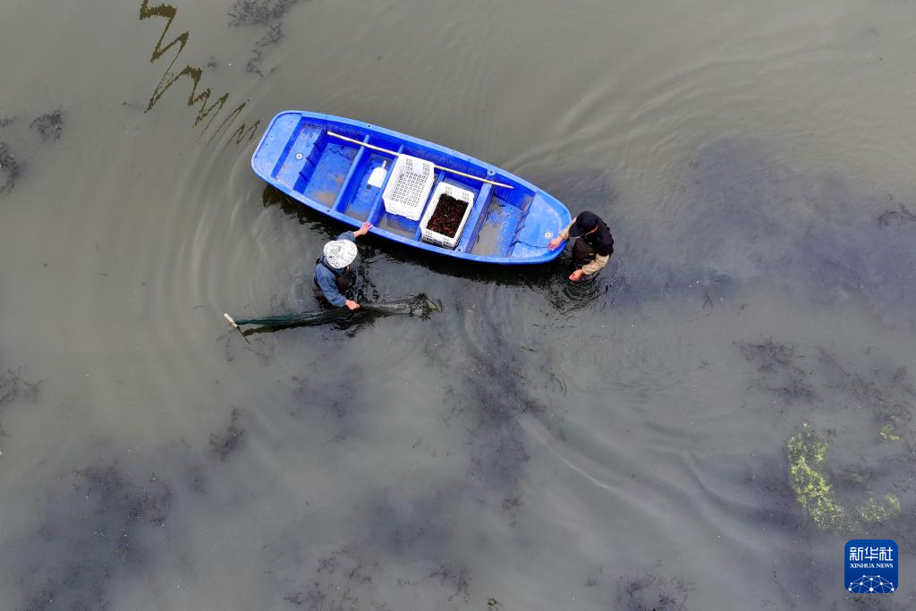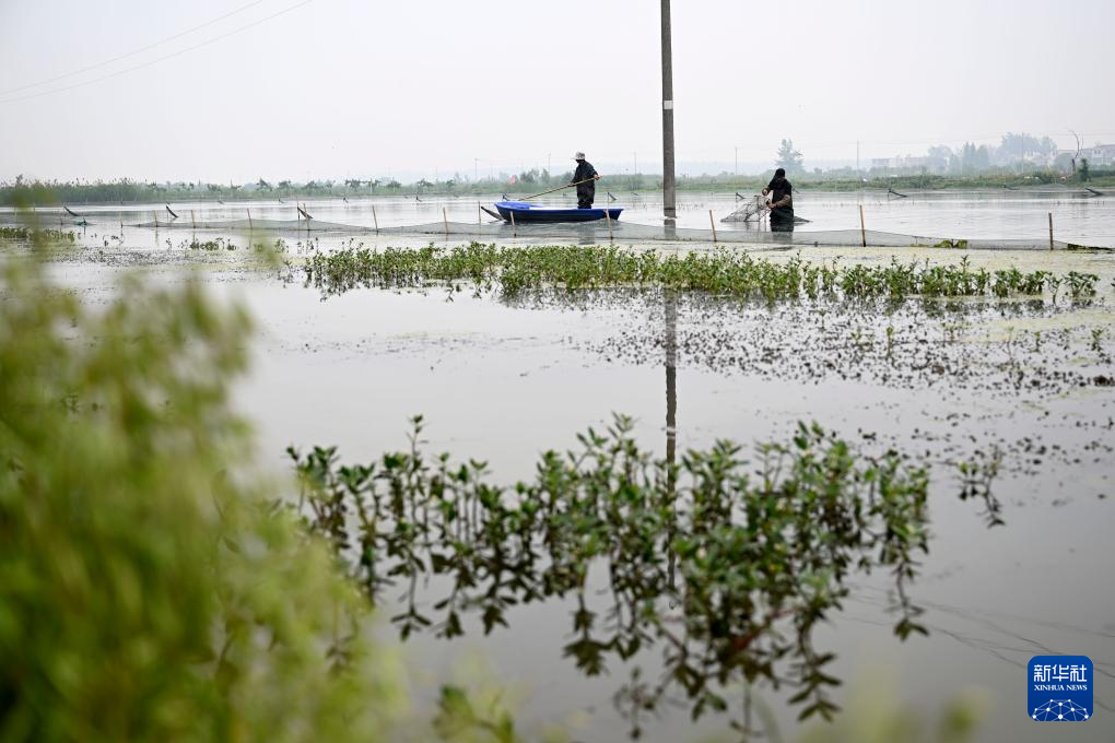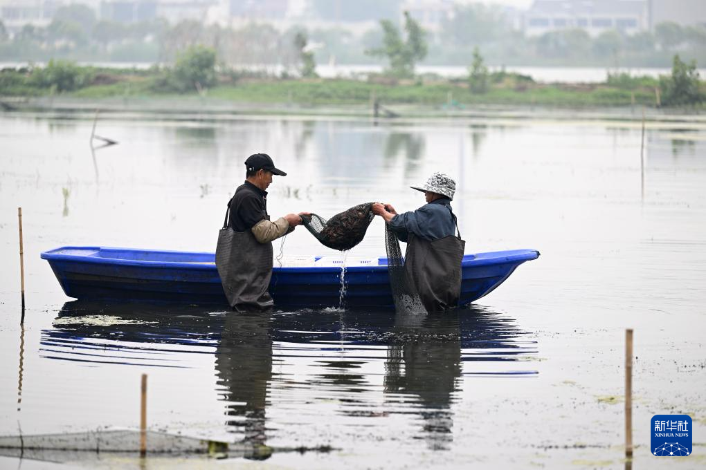 5月15日,在蚌埠市五河县沱湖乡大岗村,工作人员在捕捞小龙虾。