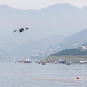 5月15日,在重庆市奉节县开展的三峡库区地方航道危岩地灾应急实战演练现场,救援无人机在营救模拟落水人员。