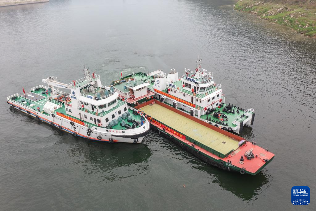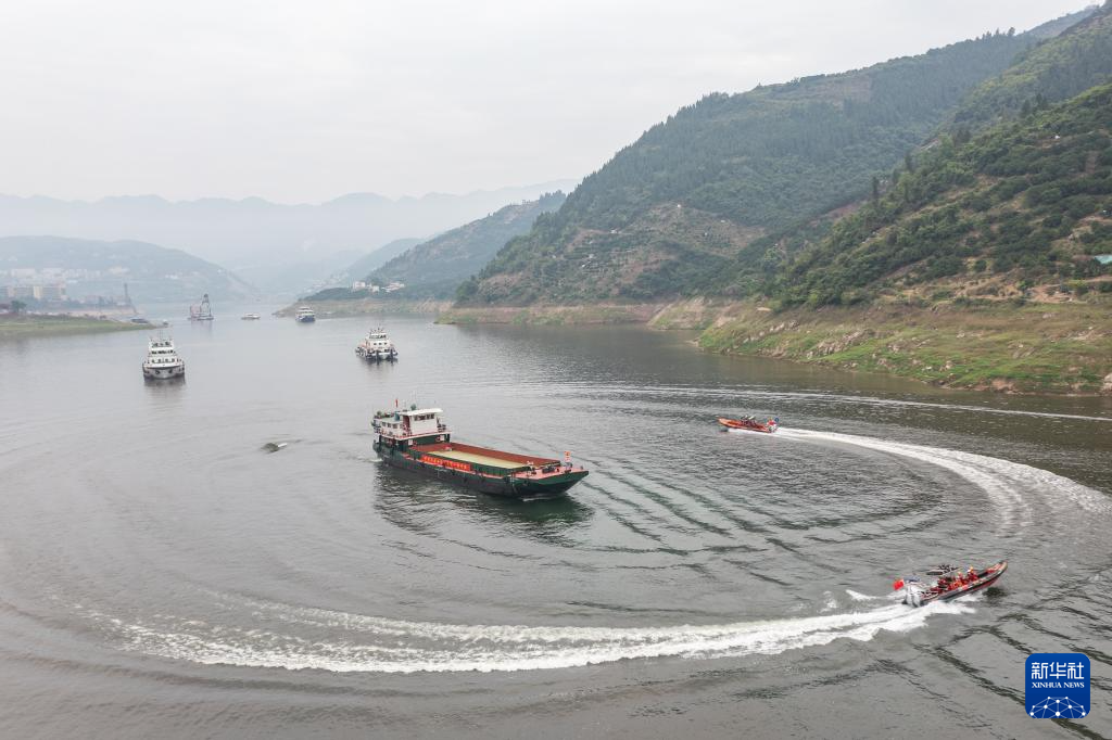 5月15日,在重庆市奉节县开展的三峡库区地方航道危岩地灾应急实战演练现场,拖救船舶在模拟事故水域对断链断缆货轮进行救援(无人机照片)。