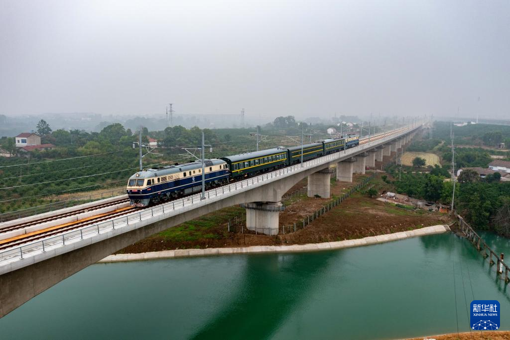 5月15日,55103次检测列车在对沪渝蓉高铁武宜段进行综合测试(无人机照片)。