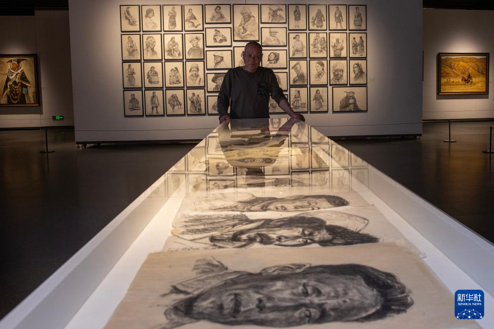 这是一张拼版照片,上图为:1983年冬,张鹰在尼木县写生(受访者供图);下图为:张鹰在西藏美术馆自己画展上的“素描墙”前(新华社记者姜帆摄5月13日摄)。