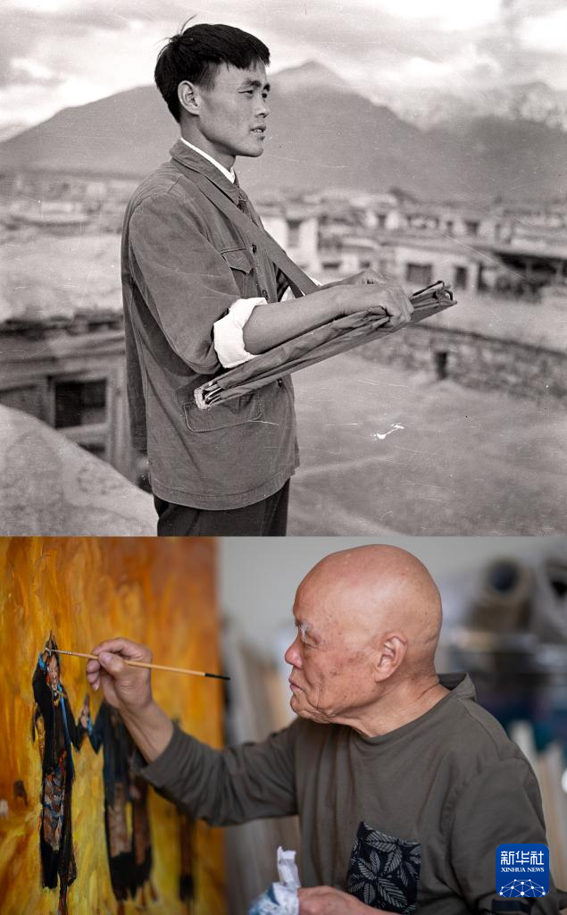 这是一张拼版照片,上图为:1973年,初到西藏不久的张鹰在八廓街房顶上写生(受访者供图);下图为:张鹰在拉萨的画室作画(新华社记者姜帆摄5月13日摄)。