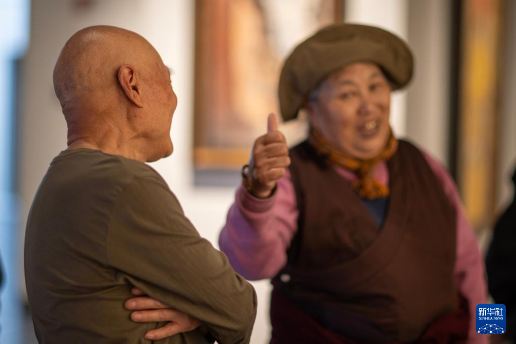 一位藏族观众在西藏美术馆参观张鹰的画展时夸赞他的画(5月13日摄)。