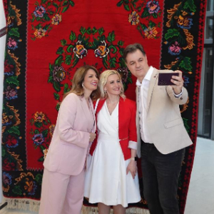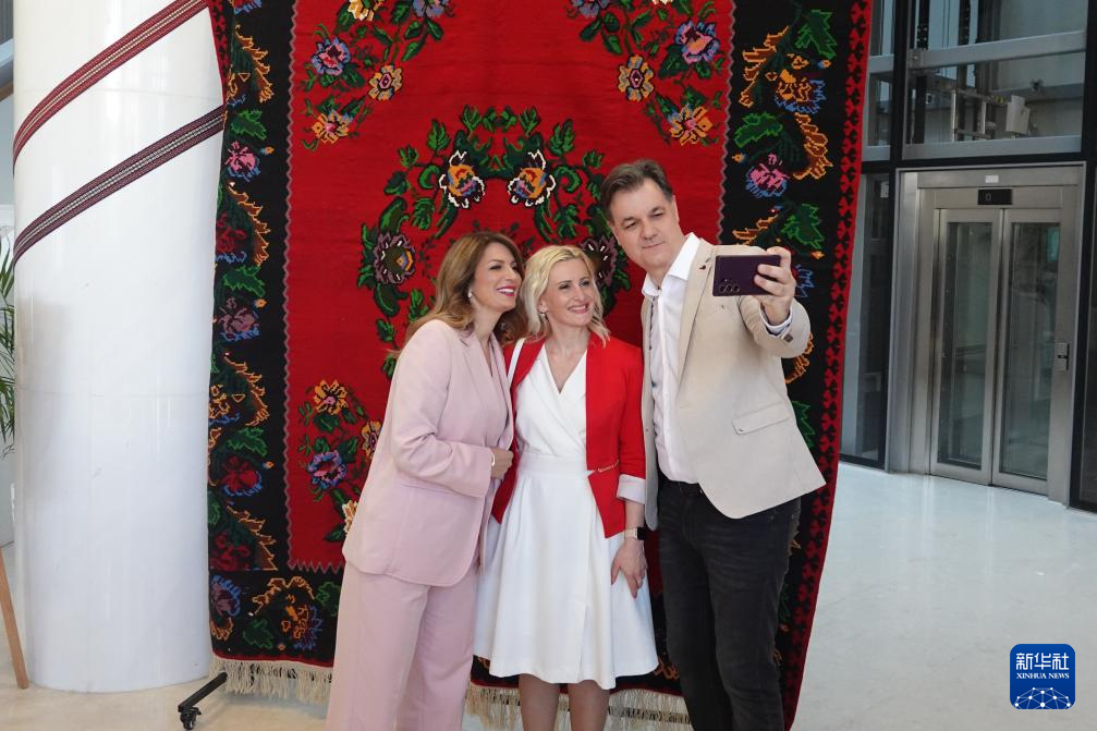 5月15日,在塞尔维亚首都贝尔格莱德,塞尔维亚发展基金会主席塔季扬娜·马蒂奇(左)和塞尔维亚手工业者协会主席薇奥莱塔·奥瓦诺维奇(中)参观“中塞人民友谊70年——文化遗产的桥梁”主题展。