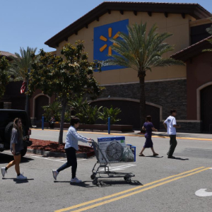 5月15日,在美国加利福尼亚州洛杉矶县罗斯米德市,顾客推行购物车走在一家沃尔玛商店外。