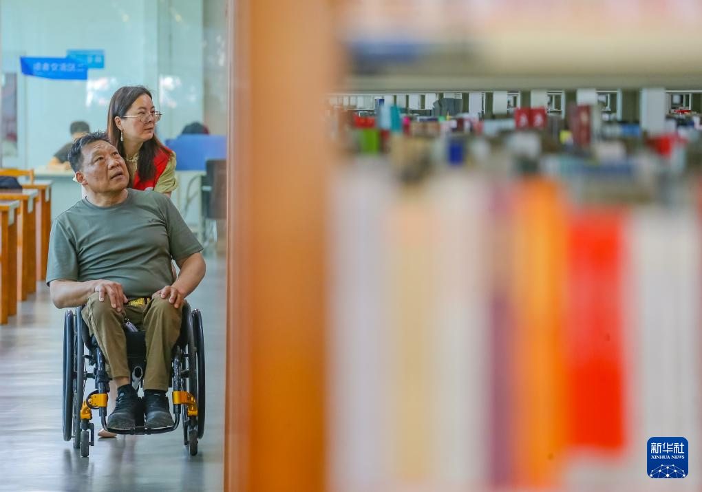 5月17日,志愿者在江苏省句容市图书馆协助一名肢体障碍读者借阅书籍。