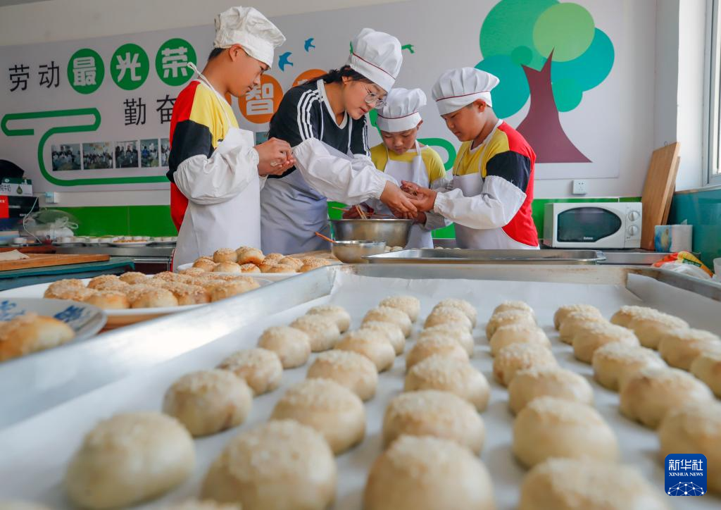 5月15日,河北省遵化市特殊教育学校的老师在和学生一起做棋子烧饼。