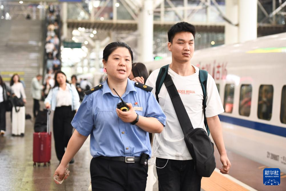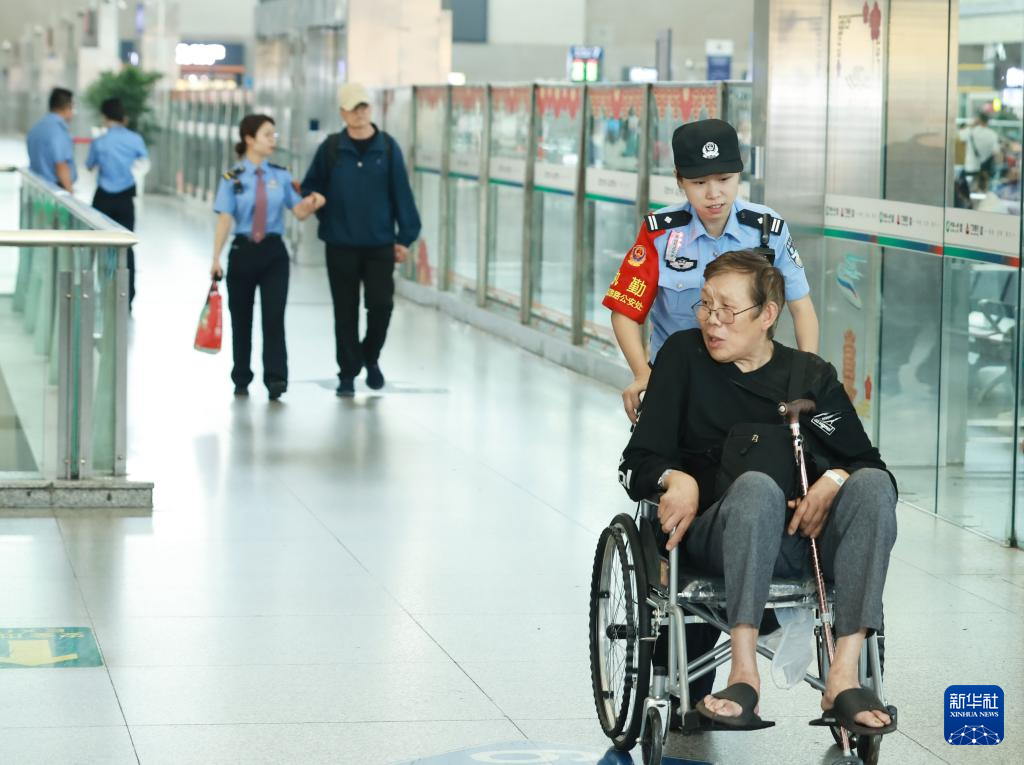5月17日,在湖北省武昌站,民警和铁路工作人员帮助行动不便的旅客出站。