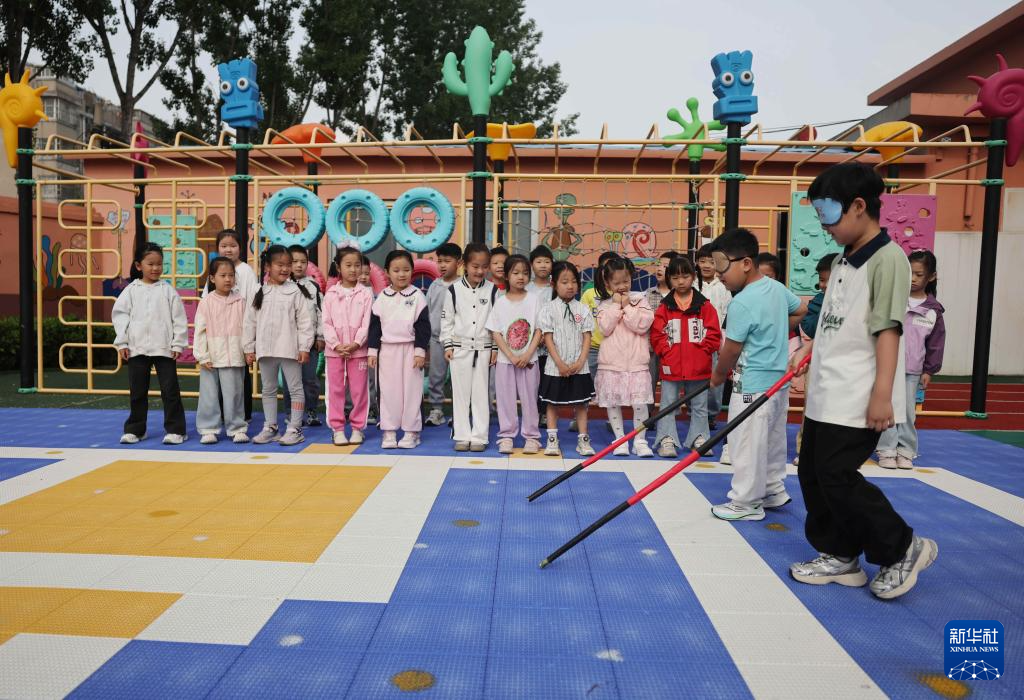 5月17日,在山东省临沂市沂南县界湖街道中心幼儿园,两名小朋友带着眼罩体验视障人士出行。