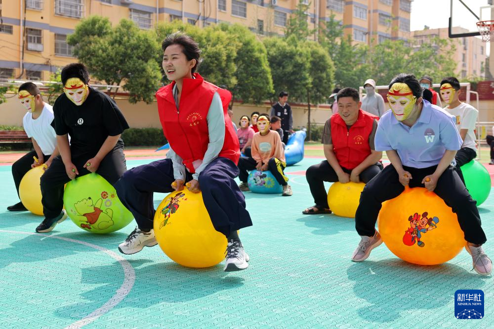 5月16日,在江苏省扬州市江都区特殊教育学校,青年志愿者和智力障碍学生一起做“羊角球”蹦蹦跳游戏。