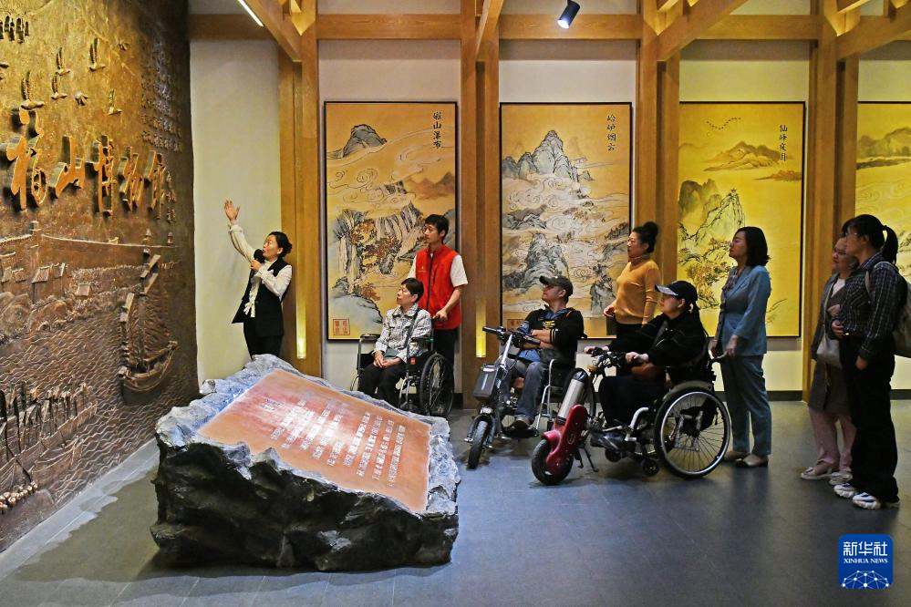 5月16日,在山东省烟台市福山博物馆,助残志愿者陪同残障人士参观。