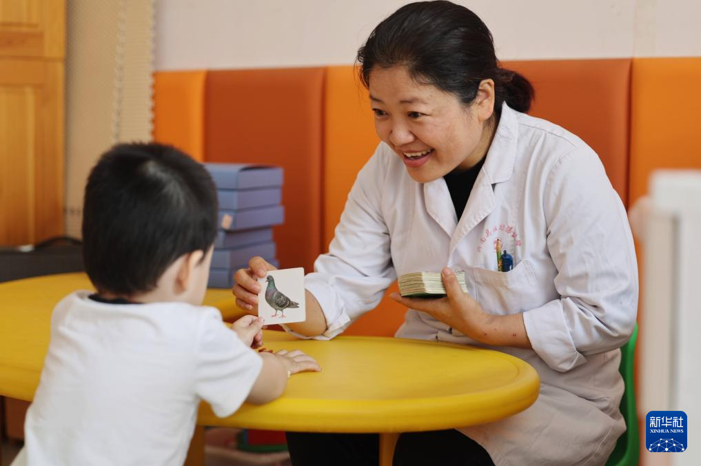 5月17日,在山东省临沂市沂南县妇幼保健院残障儿童康复中心,康复治疗师在帮助患儿进行认知训练。