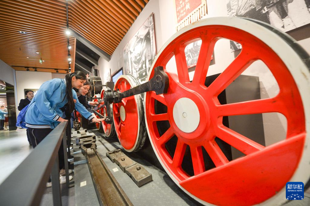 5月17日,在胶济铁路青岛博物馆,国铁济南局青岛客运段助盲志愿者(右)引导潍坊盲校的孩子触摸展品。