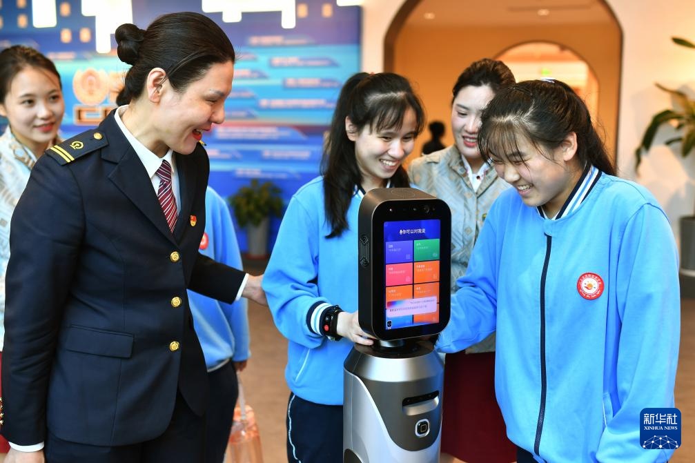 5月17日,在胶济铁路青岛博物馆,国铁济南局青岛客运段助盲志愿者引导潍坊盲校的孩子与车站服务机器人互动。