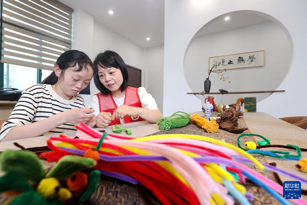 5月17日,在浙江省湖州市德清县雷甸镇成人文化技术学校,残障学员在志愿者指导下制作手工艺品。