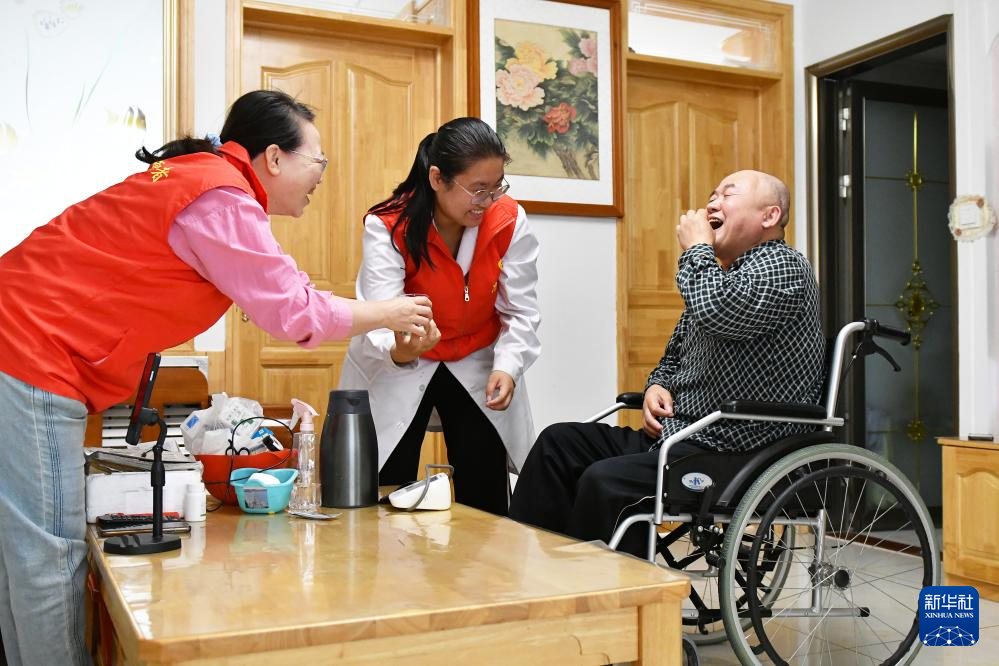 5月17日,在山东省烟台市福山区清洋街道福惠社区,助残志愿者入户和残疾人拉家常。