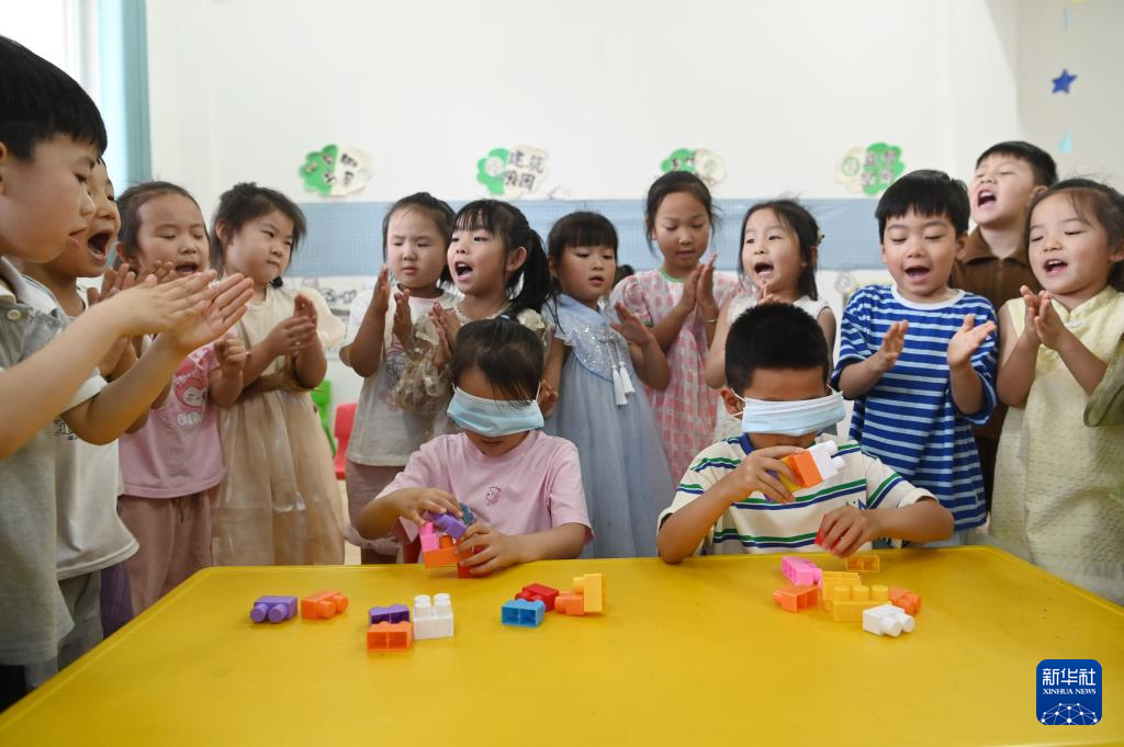 5月16日,在河南省沁阳市第一幼儿教育集团白庄村幼儿园,两名小朋友戴着眼罩做拼插建构游戏。