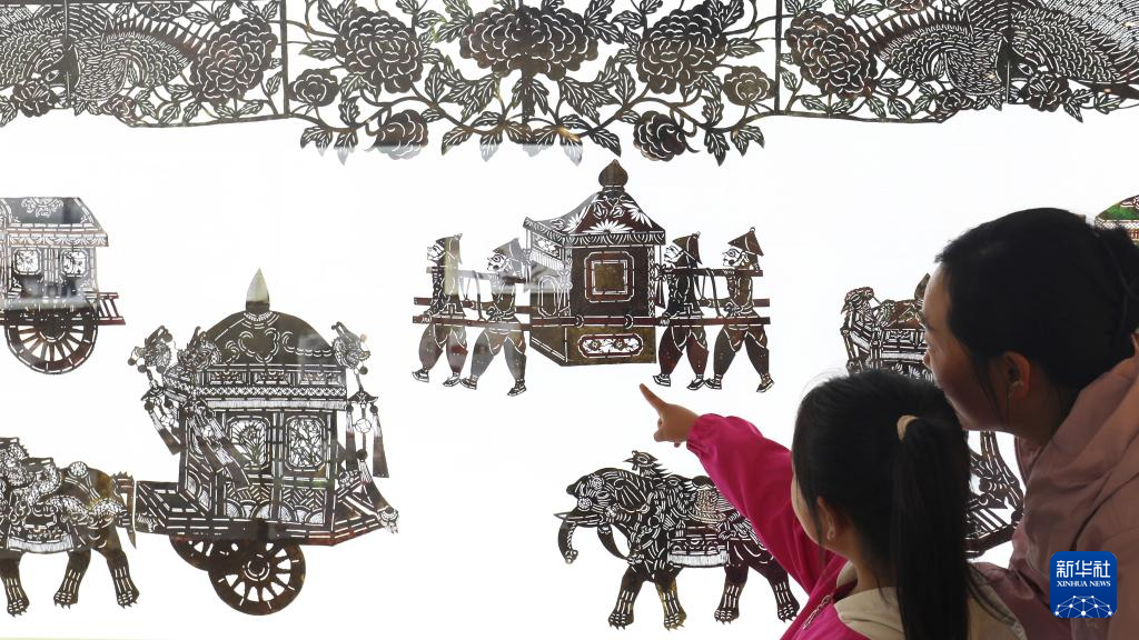 5月17日,观众在河北省唐山市丰润博物馆参观皮影展览。