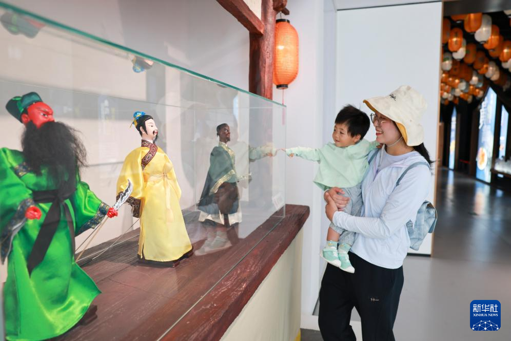 5月17日,家长带着孩子在江苏省泰兴市博览中心非遗馆内参观非遗项目“杖头木偶戏”展台,观赏传统木偶造型。