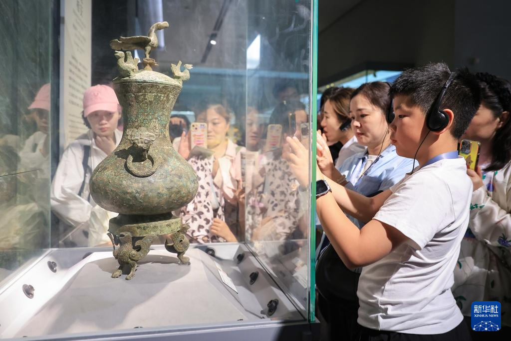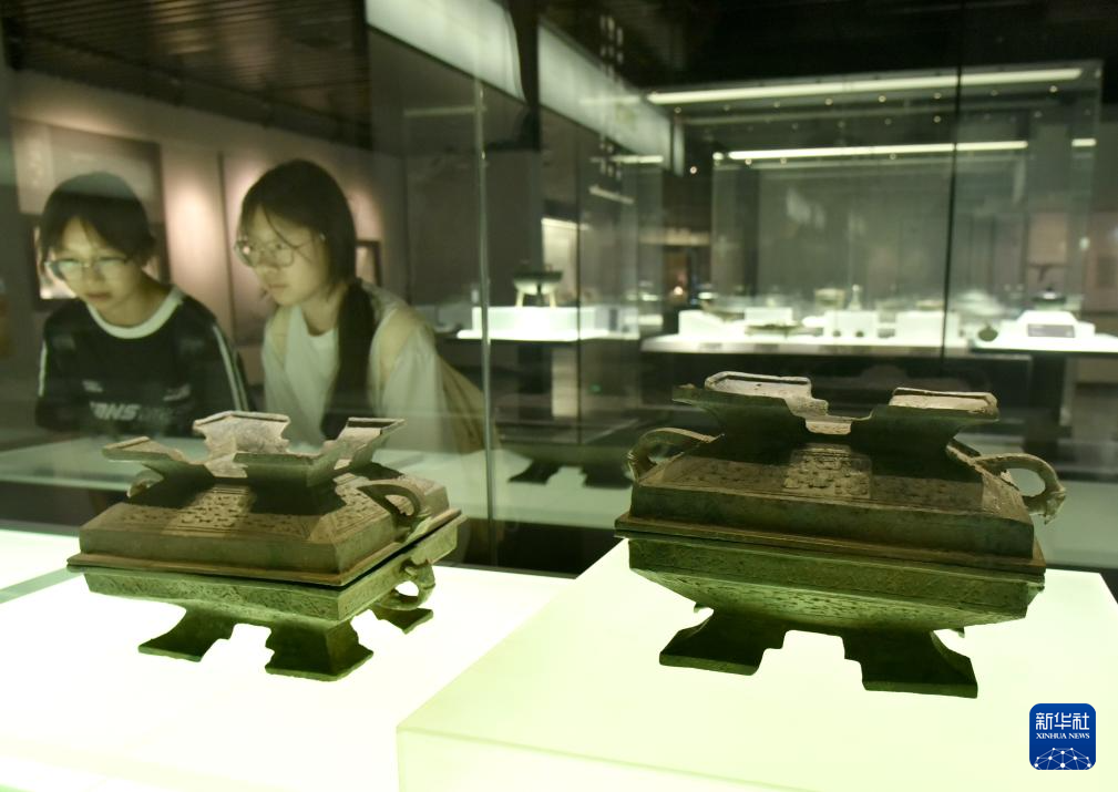 5月17日,市民在山东省枣庄市博物馆观看青铜器展品。