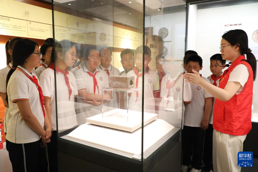 5月17日,在湖南省永州市道县博物馆,一名老师带着学生在参观。