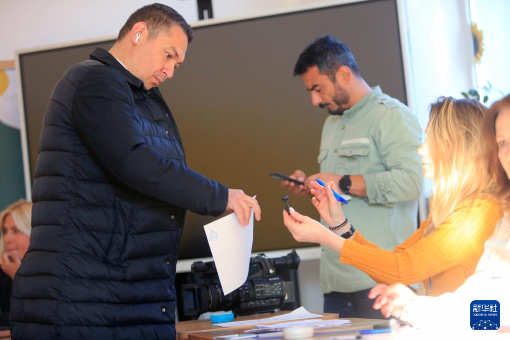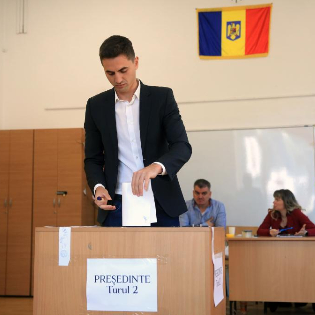 5月18日,在罗马尼亚弗格拉什市一处投票站,独立候选人、布加勒斯特市长尼库绍尔·达恩参加总统选举第二轮投票。