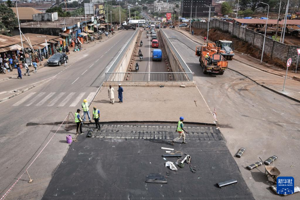 这是5月1日在几内亚首都科纳克里拍摄的邦贝德立交桥项目建设现场(无人机照片)。