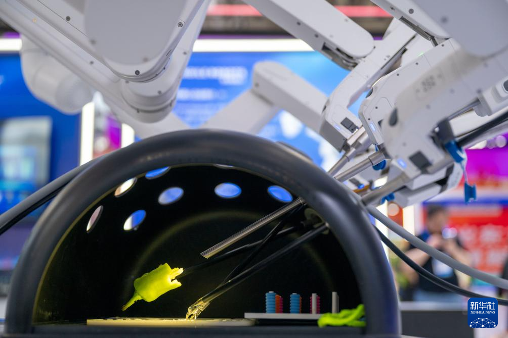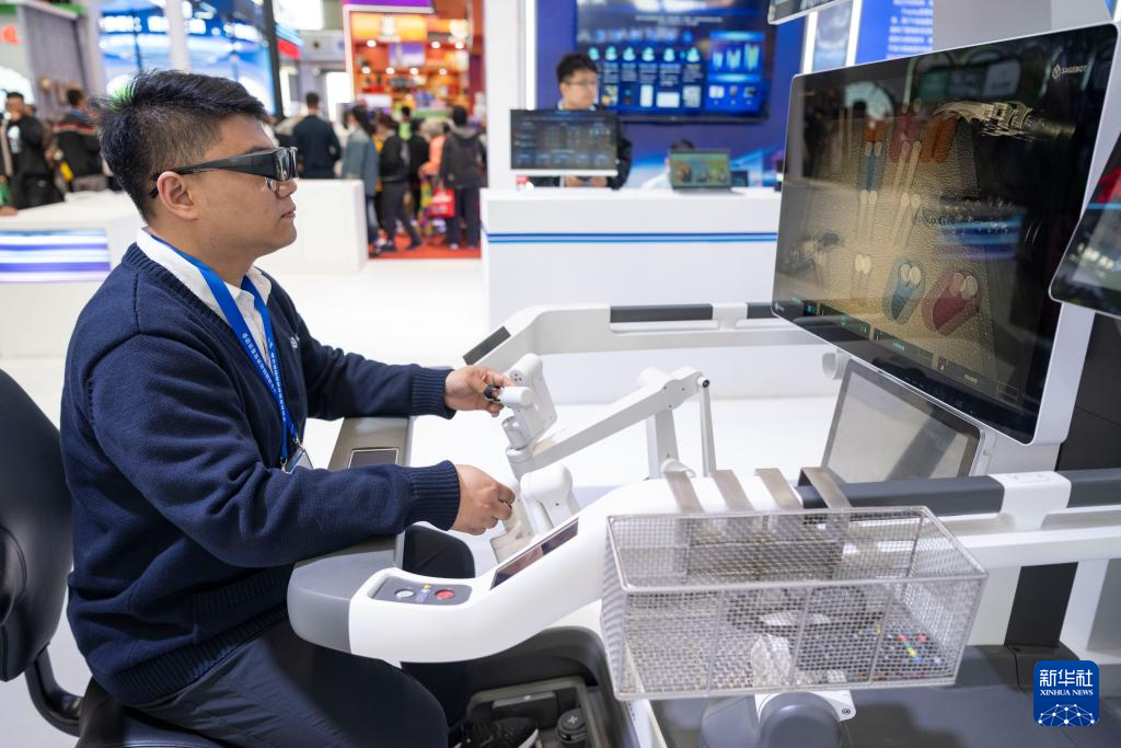 5月19日,在哈洽会主会场,与会者操控医疗机器人进行模拟手术。