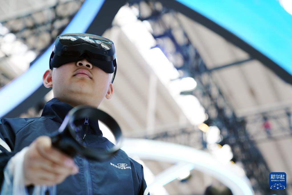 5月18日,一名小朋友在哈洽会主会场体验AI与VR技术结合的智能化眼镜。