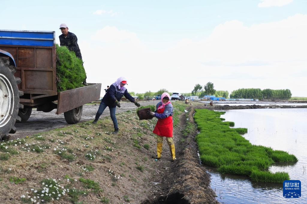 5月19日,农民在内蒙古兴安盟突泉县东杜尔基镇明星村的稻田旁搬运秧苗。