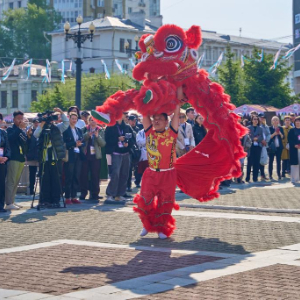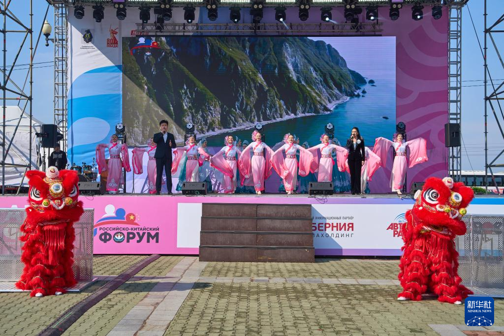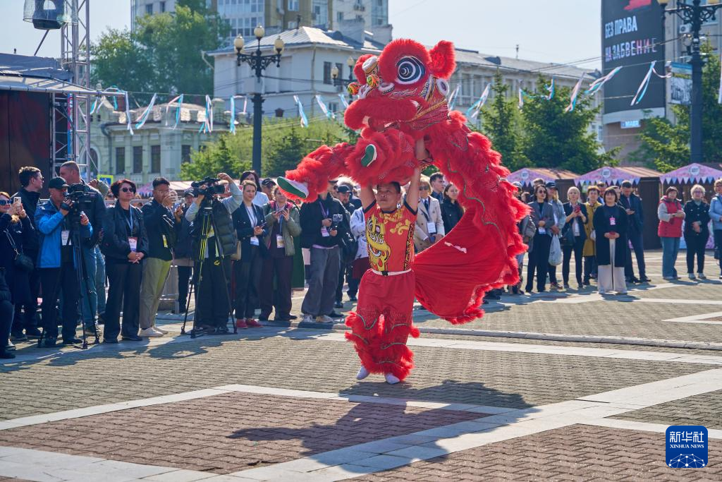 这是5月19日在俄罗斯哈巴罗夫斯克拍摄的“俄中论坛”开幕式上的舞狮表演。