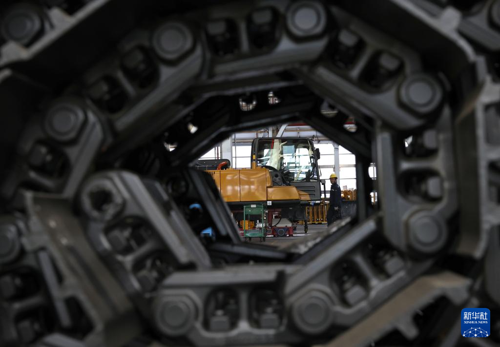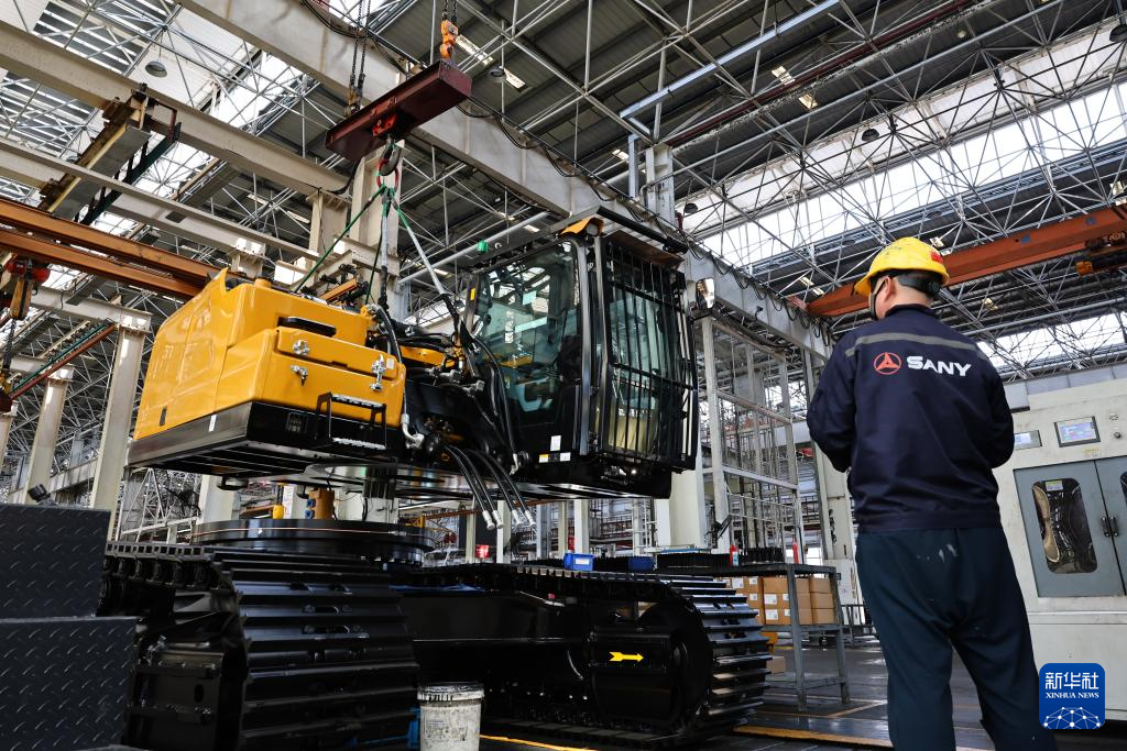 工人在上海三一重机股份有限公司产线上工作(4月15日摄)。