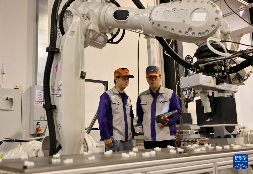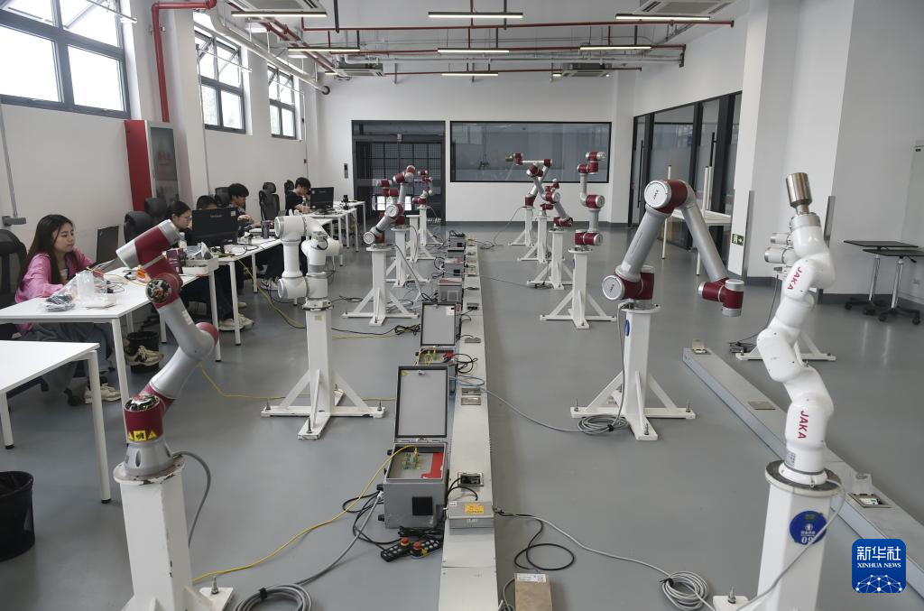 技术人员在上海节卡机器人股份有限公司的性能测试区对机器人进行测试(4月24日摄)。该公司是一家聚焦于新一代协作机器人本体与智慧工厂创新研发的高新技术企业,相关产品服务于汽车、电子、半导体等全球知名品牌的生产线,也在众多商业新消费领域从事与消费者直接接触的服务工作。