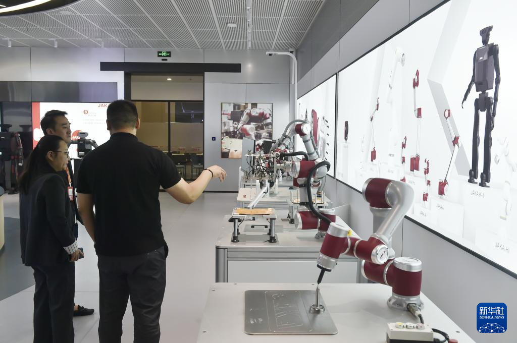 来访者在上海节卡机器人股份有限公司的产品展示厅参观展出的机器人(4月24日摄)。