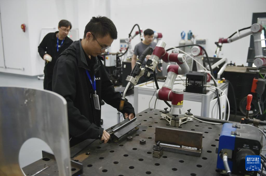 技术人员在上海节卡机器人股份有限公司的性能测试区调试焊接机器人(4月24日摄)。
