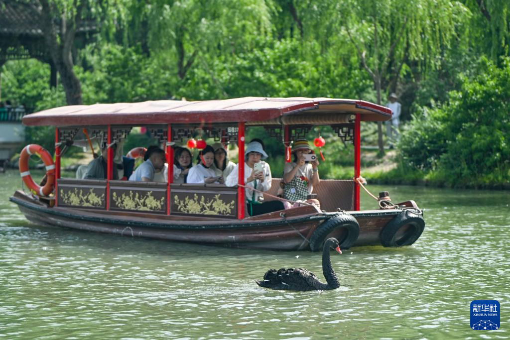 游客在江苏扬州瘦西湖风景区乘船拍摄水中黑天鹅(5月19日摄)。