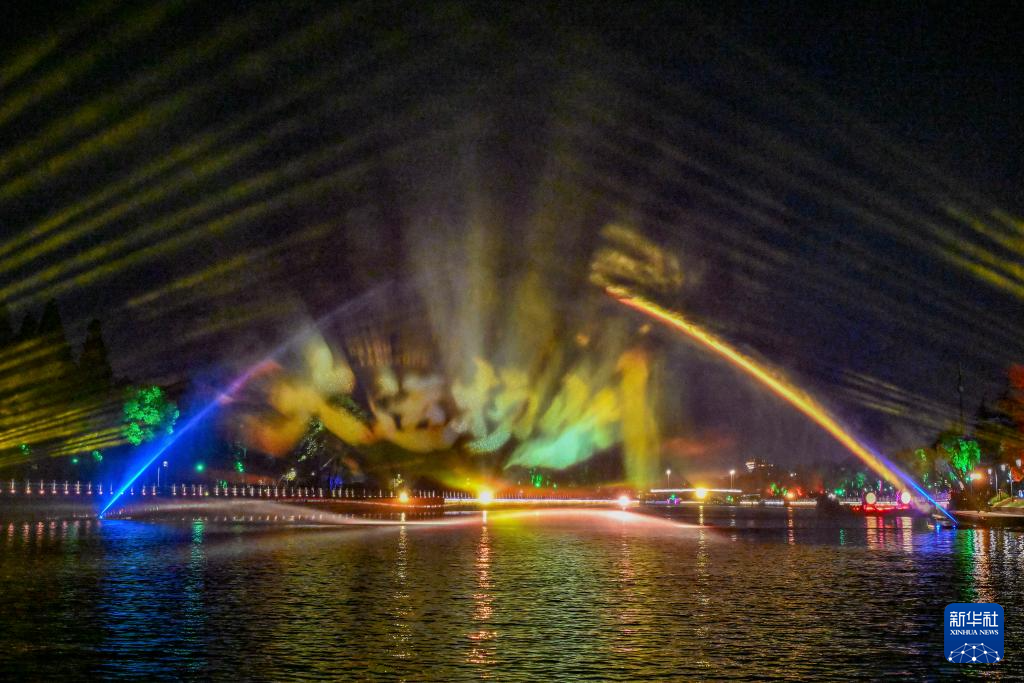 这是江苏扬州“大运扬州”古运河行进式游船演绎体验项目灯光秀(5月19日摄)。