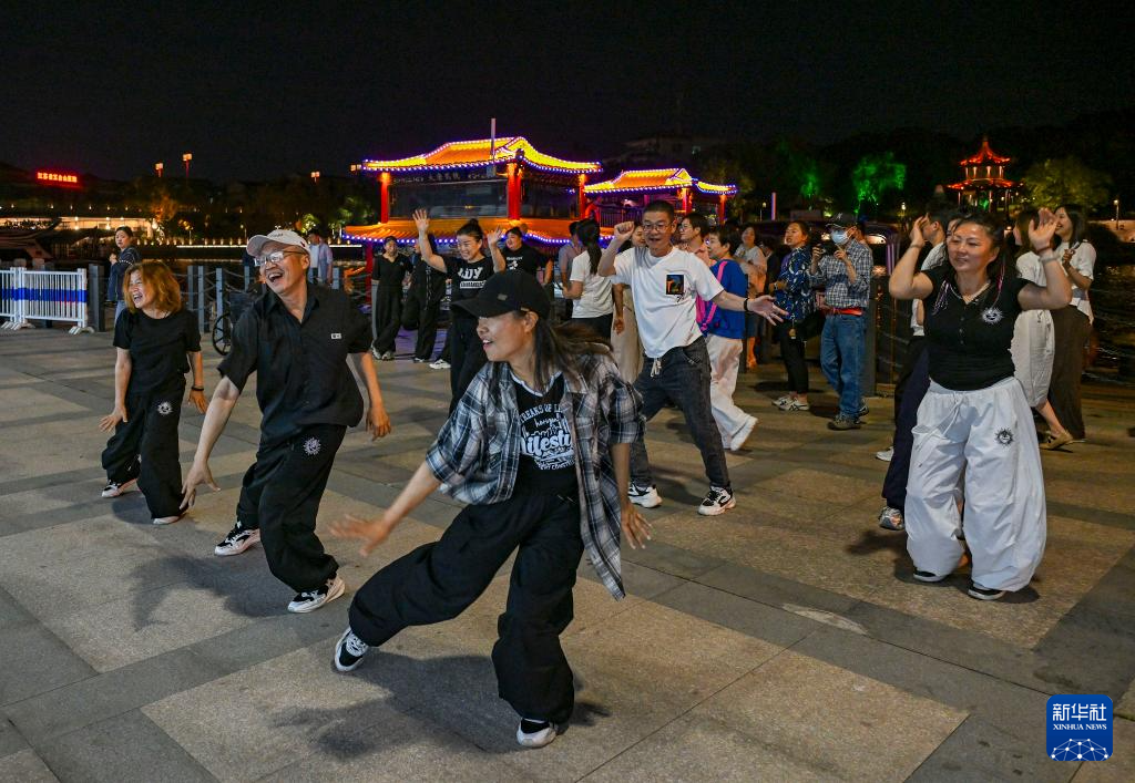 人们在大运河畔跳街舞(5月19日摄)。