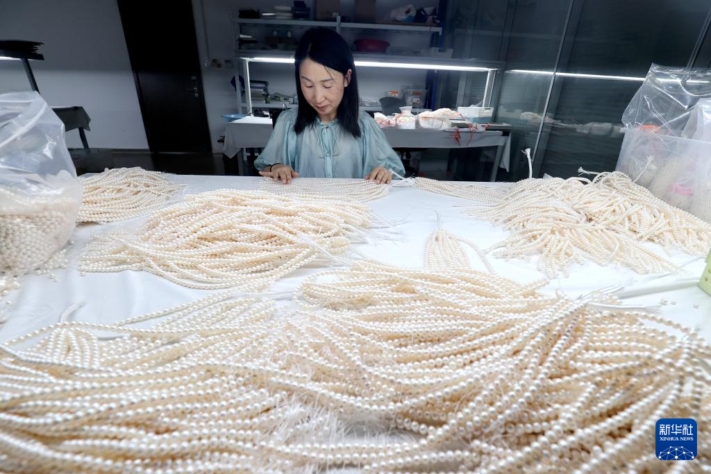 5月21日,浙江省湖州市德清县一珍珠生产企业工人在车间内加工珍珠饰品。